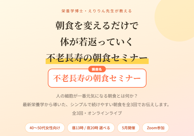 最新栄養学から導き出した「細胞が元気になる朝食」をお伝えするオンラインセミナー(全3回)を5月に開催いたします。